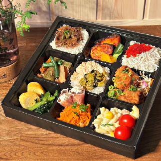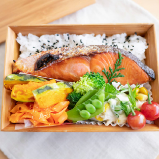 ご要望に合わせて、お魚も、お肉も。 彩り豊かなおかずをぎゅっと詰め込んだ、栄養バランス満点のお弁当。 健康的で満足感たっぷり。